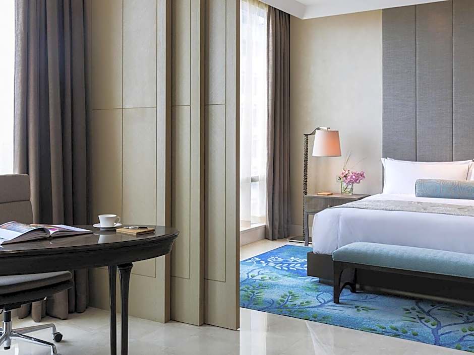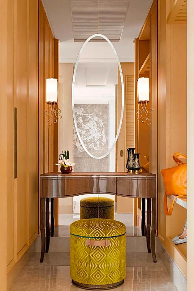 Offering panoramic views of the city, this corner suite has a separate living room and a working area. It also comes with a walk-in wardrobe, an private bathroom and an additional washroom for guests.